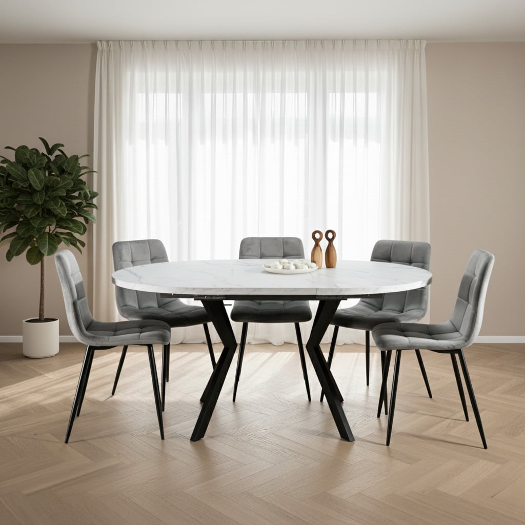 פינת אוכל עגולה נפתחת דמוי שיש לבן דגם אלמוס + 6 כסאות – 8 סועדים