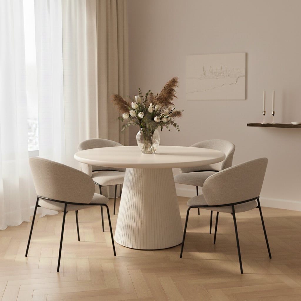 שולחן דגם ראונדי הוא שילוב מדויק בין עיצוב עכשווי לקווים נקיים ואלגנטיים. המשטח העליון עשוי MDF איכותי שעבר צביעה לבנה חלקה ואחידה, שמעניקה לשולחן מראה מוקפד ונקי, כזה שמשתלב בהרמוניה כמעט בכל סגנון עיצובי. הרגל המיוחדת של השולחן, שעשויה מחיתוכי CNC מדויקים, יוצרת טקסטורה עדינה ומעניינת שמוסיפה רובד של עומק וייחודיות לכל החלל. בזכות הצורה העגולה שלו והגימור האלגנטי, ראונדי מתאים הן לאזורי אירוח והן לפינות אוכל אינטימיות, ומכניס טאץ’ מודרני ושקט לכל חדר שבו הוא נמצא.