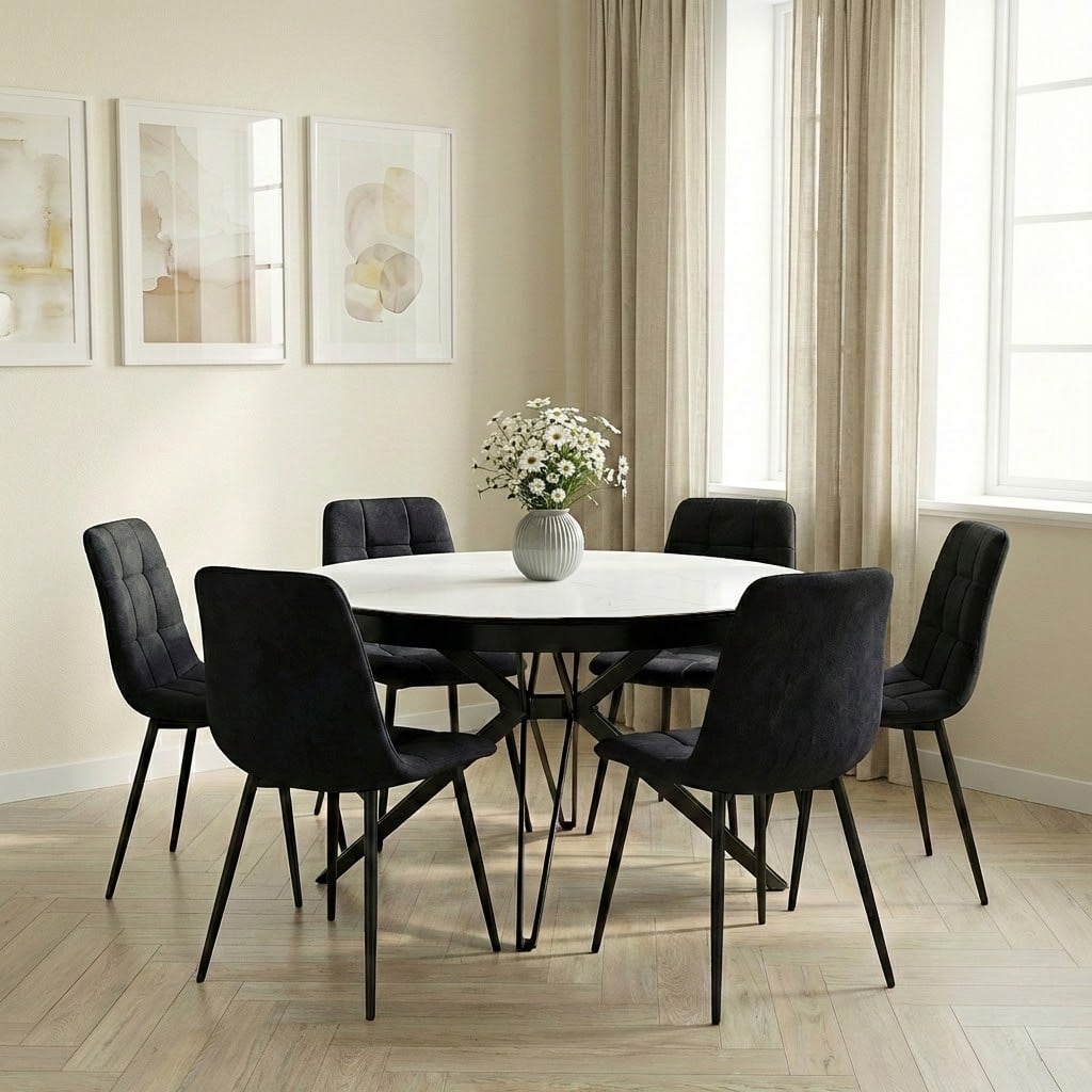 פינת אוכל עגולה נפתחת דגם קסטלו דמוי שיש לבן + 6 כסאות – 10 סועדים