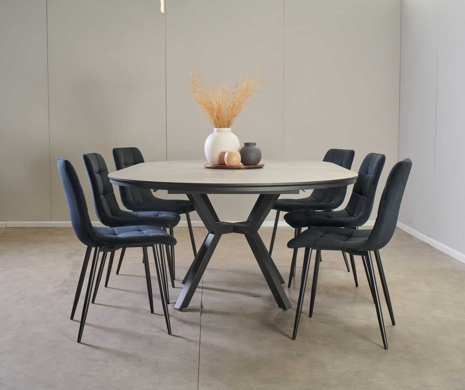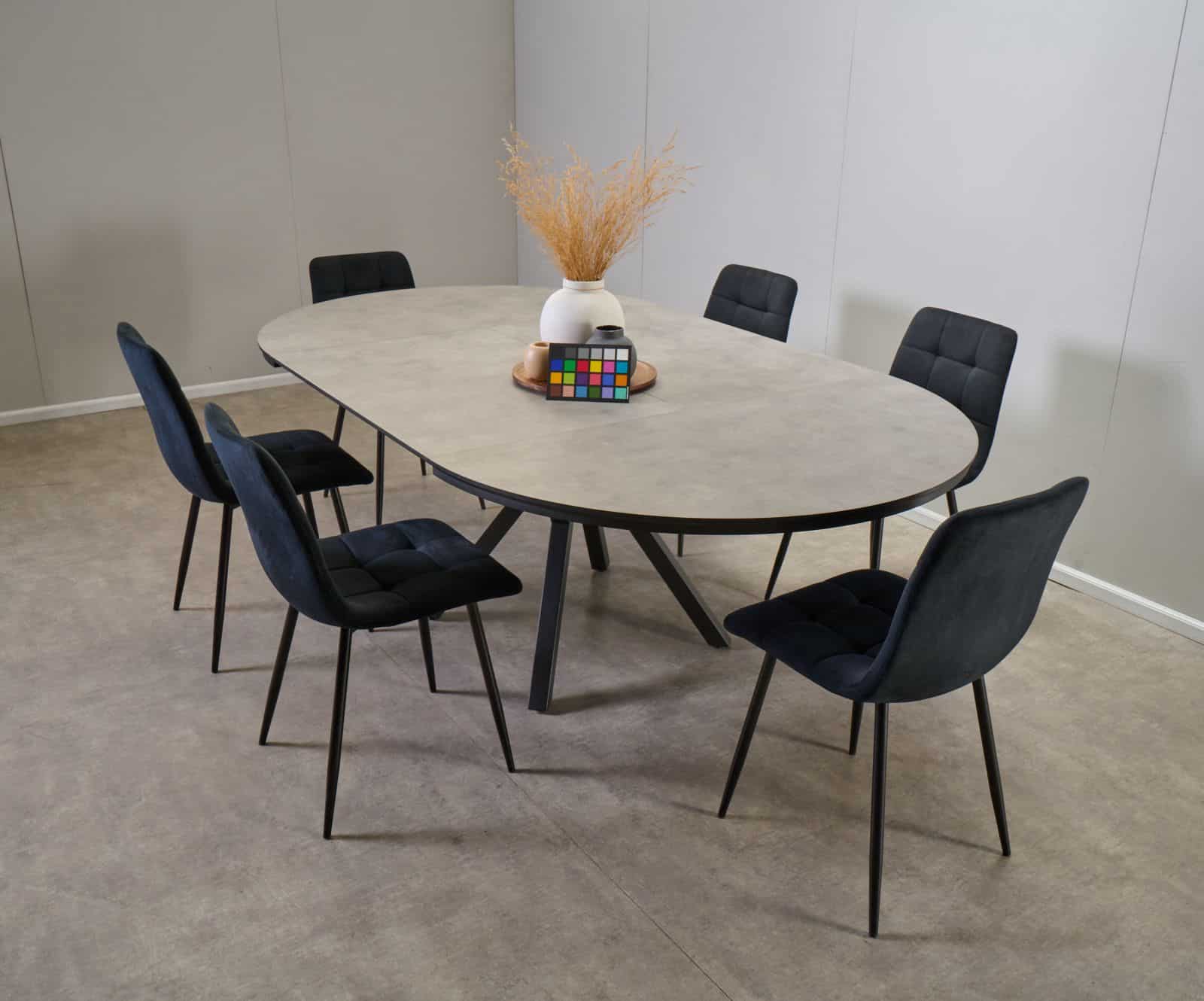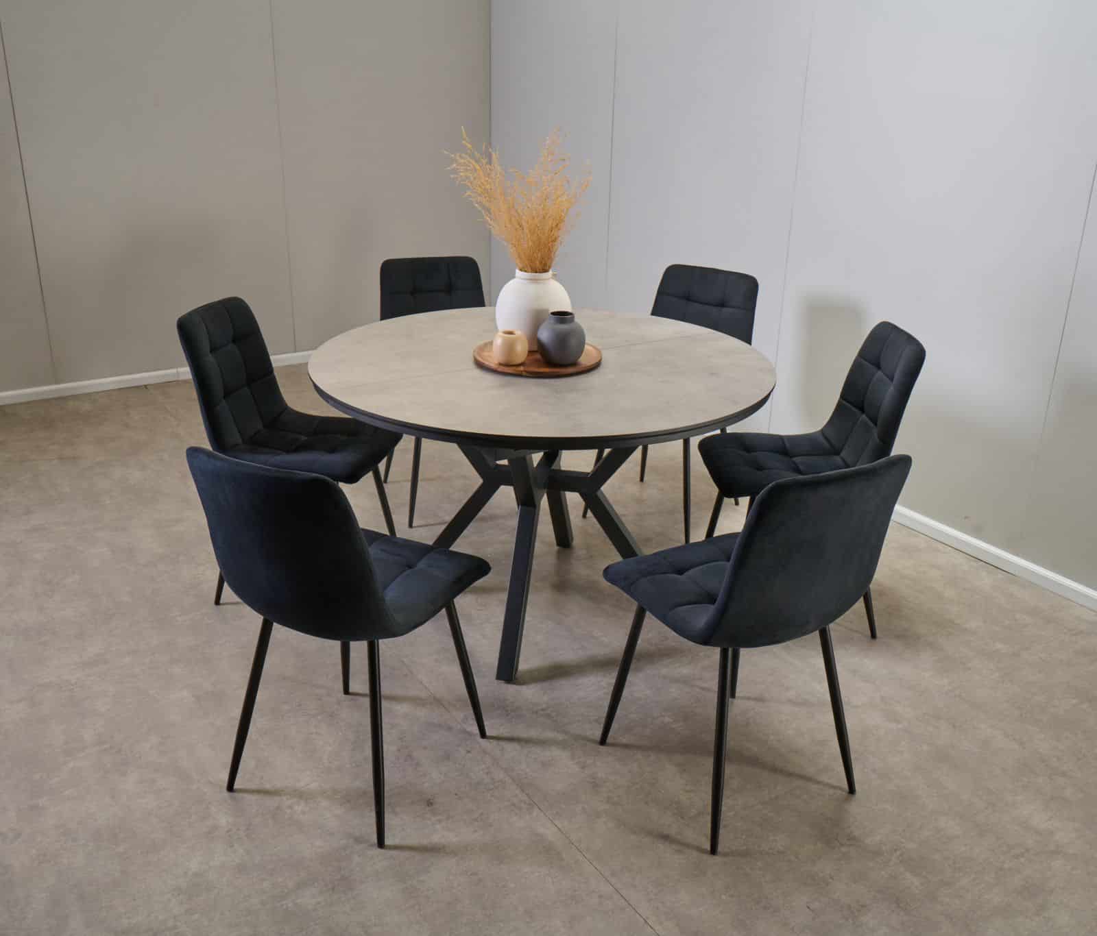 פינת אוכל עגולה נפתחת דמוי בטון דגם לונגו + 6 כסאות – 10 סועדים