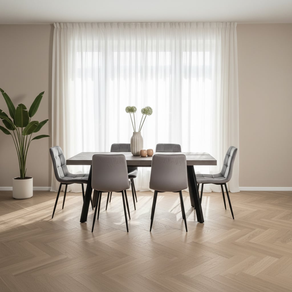 פינת האוכל כוללת שולחן המעוצב בקו איטלקי עדין, המשלב בין חומרים של מתכת שחורה אלגנטית ודמוי בטון המקנה לחלקי המתכת מראה אלגנטי ומונעת אפשרות של חלודה.