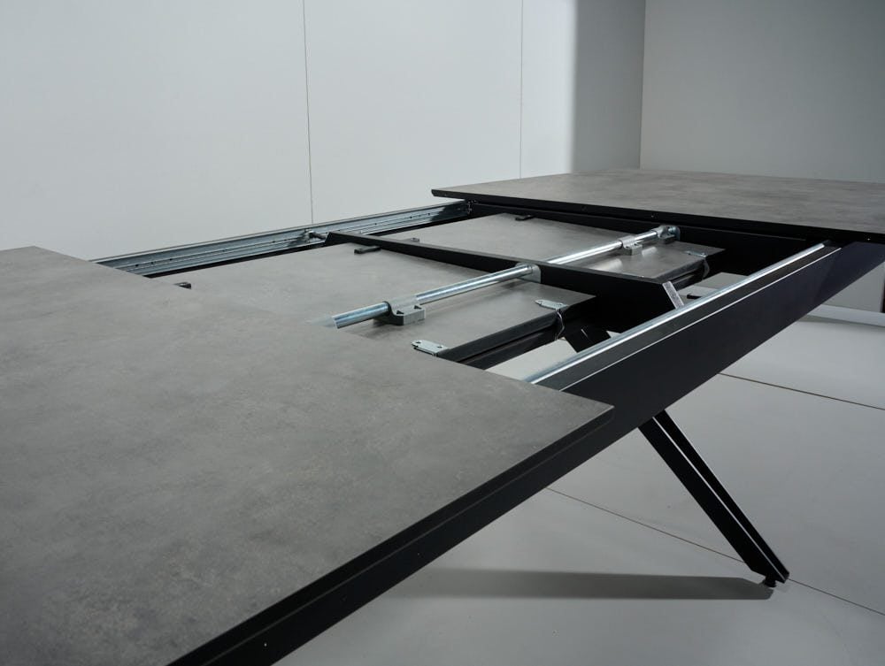 השולחן באורך 2.08 מ’ ובעל 2 הארכות של 45 ס”מ נוספים ואורך מלא של 2.98 מ’.