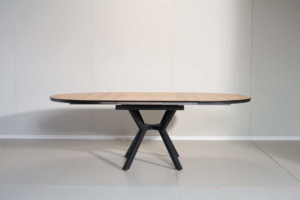 השולחן בקוטר 1.30 מ' בעל 2 הארכות של 50 ס"מ נוספים וקוטר מלא של 2.36 מ'.
